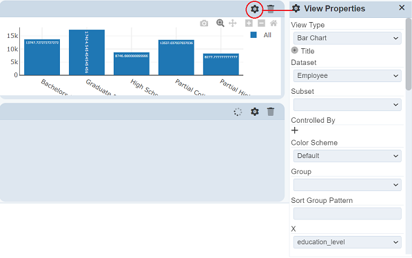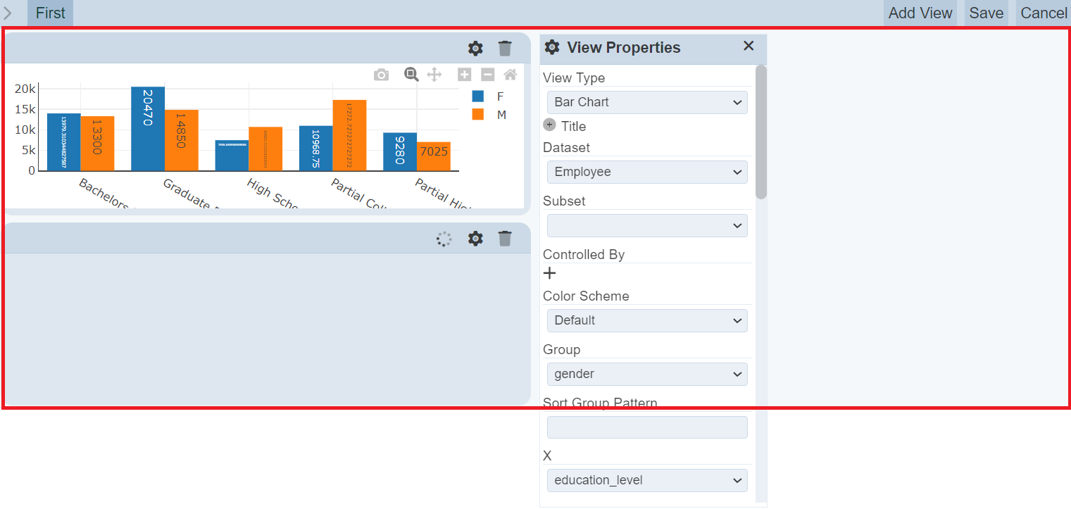 For this example, a bar chart would be created. Below are the properties that are not populated by default but are required to be manually populated to render a pie chart. The order of populating the properties are listed on the Order column below, with the first one starting at 1. Note that changes made to the View Properties panel are done live, meaning that changes are reflected immediately. Values used for the example are detailed on the Value column.