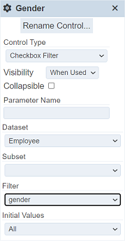 To use a control, the control must be linked to a dataset by adding it to the Controlled By view property. A control can be linked to multiple views across all pages on the dashboard and a view can also be linked with multiple controls.