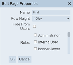 The “Edit Page Properties” dialog box appears with the page’s current properties. The same fields appear, except for the Copy From field. The Row Height field in the dialog box allows you to determine the height of the page. By default, 100px is selected. You can change the value by selecting another value in the drop-down list. The same constraints in Add Page are applied to the relevant fields.