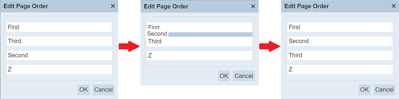 The “Edit Page Order” dialog box appears with the current page order displayed. The order of the pages appearing from left to right is listed on the dialog box from top to bottom.