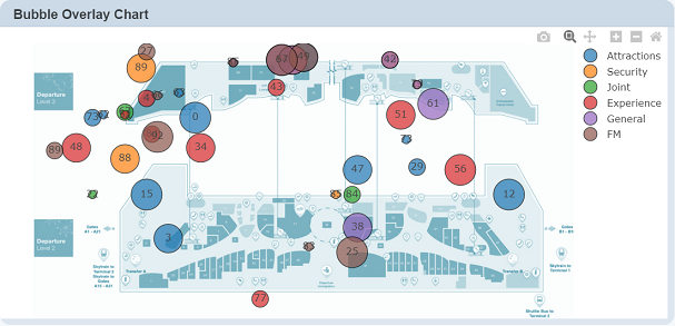 Like the bubble chart, the bubble overlay chart is used to observe the relationship between data points, with the dimension of the marker to allow comparison between three variables rather than just two, plus an overlay map to indicate the location of the markers.
