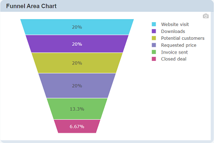 A funnel area chart is a specialized chart type that demonstrates the flow of users through a business or sales process. The chart takes its name from its shape, which starts from a broad head and ends in a narrow neck. The number of users at each stage of the process are indicated from the funnel’s width as it narrows.