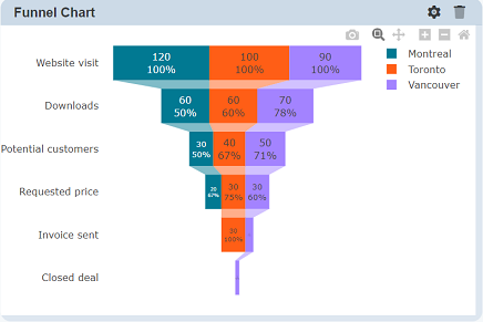 A funnel chart is a specialized chart type that demonstrates the flow of users through a business or sales process. The chart takes its name from its shape, which starts from a broad head and ends in a narrow neck. The number of users at each stage of the process are indicated from the funnel’s width as it narrows.
