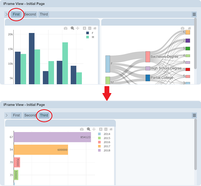 In the example above, the IFrame view is used to display the two pages in “My Dashboard”. The “First” page (default) is displayed in the IFrame view by default when the URL of “My Dashboard” is used. To display the “Second” page as the initial page when the IFrame view is displayed, ?initalPage=Secomd is added the the end of the URL.