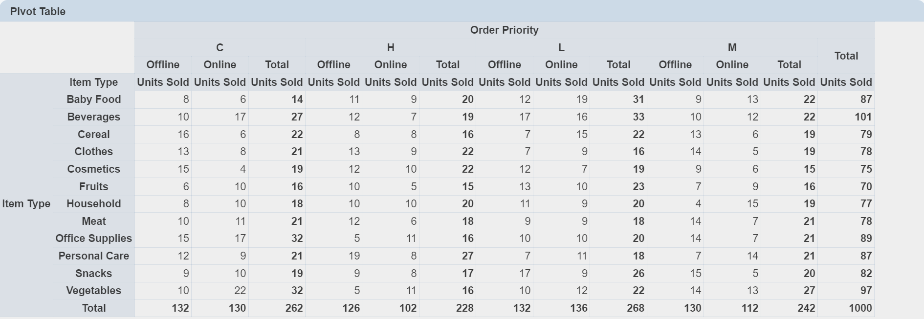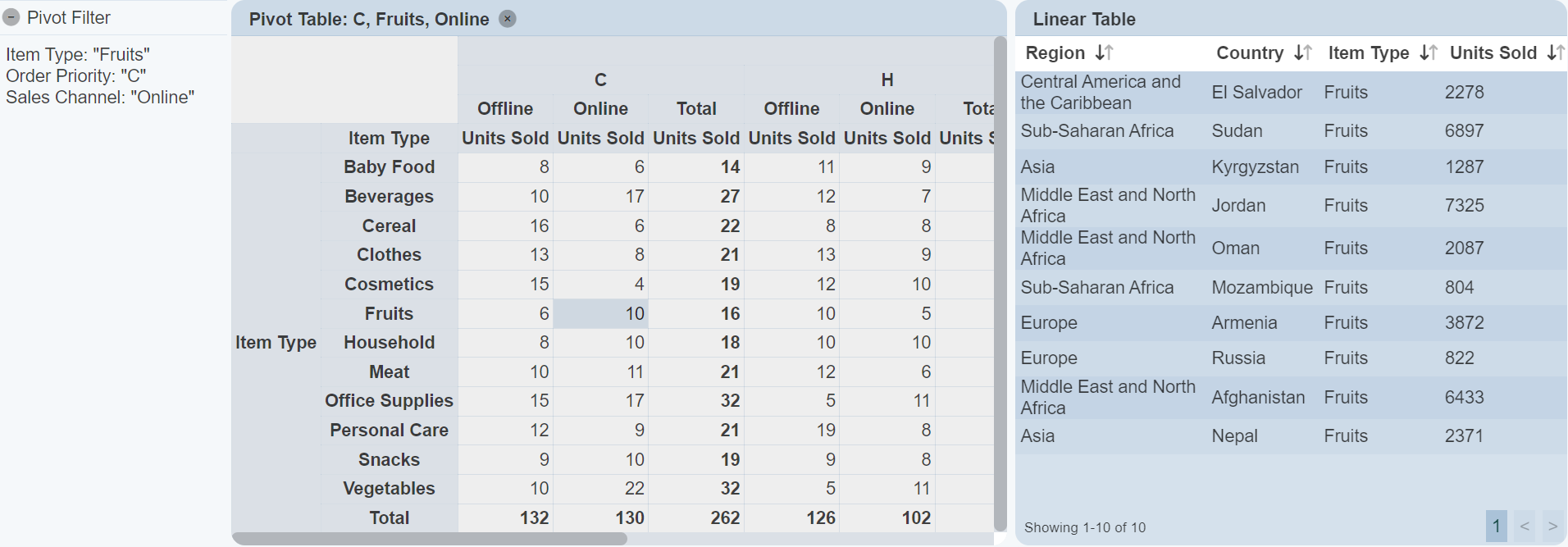 At the same time, the header row of the pivot table displays the selected item and the linear table now shows only the items from “Fruits”, “C” order priority and “Online” sales channel.