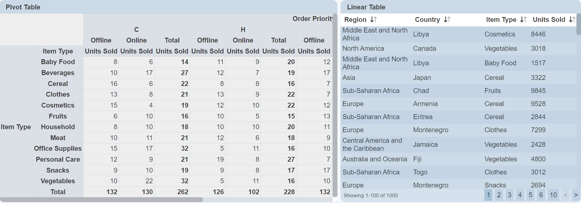 In this example, a pivot table and a linear table is created. Both uses the same dataset. Create the “Pivot Filter” to use the same dataset. In the pivot table, select the “Pivot Filter” in the “Select to Control” property.