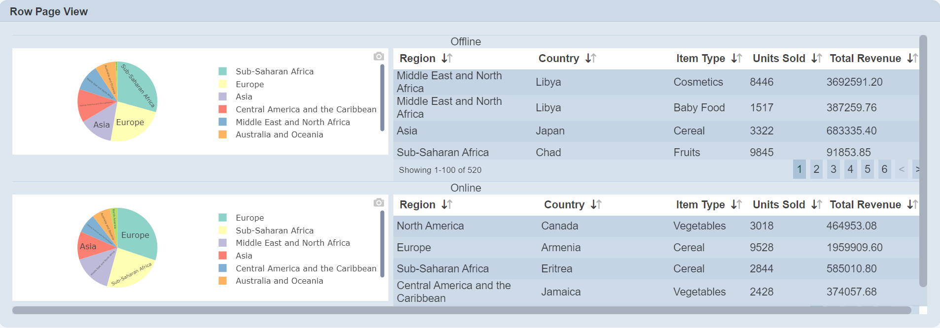In the example above, two sets of pie chart and linear table are loaded into the view. One set for Offline and the set for Online, defined by the “Group” property.