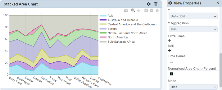 In the “View Properties” dialog box, select the “Normalised Area Chart (Percent)” field.
