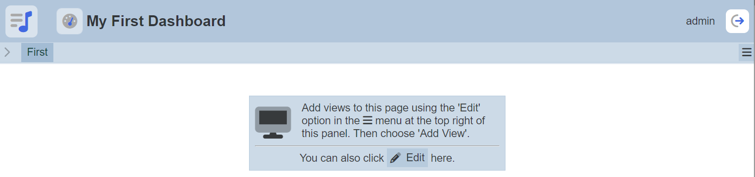 Clicking on the “OK” button on the dialog above redirects the user to the Dashboard Viewer, rendering the newly created dashboard with one page, entitled “First”. Clicking on the “Cancel” button aborts the action.