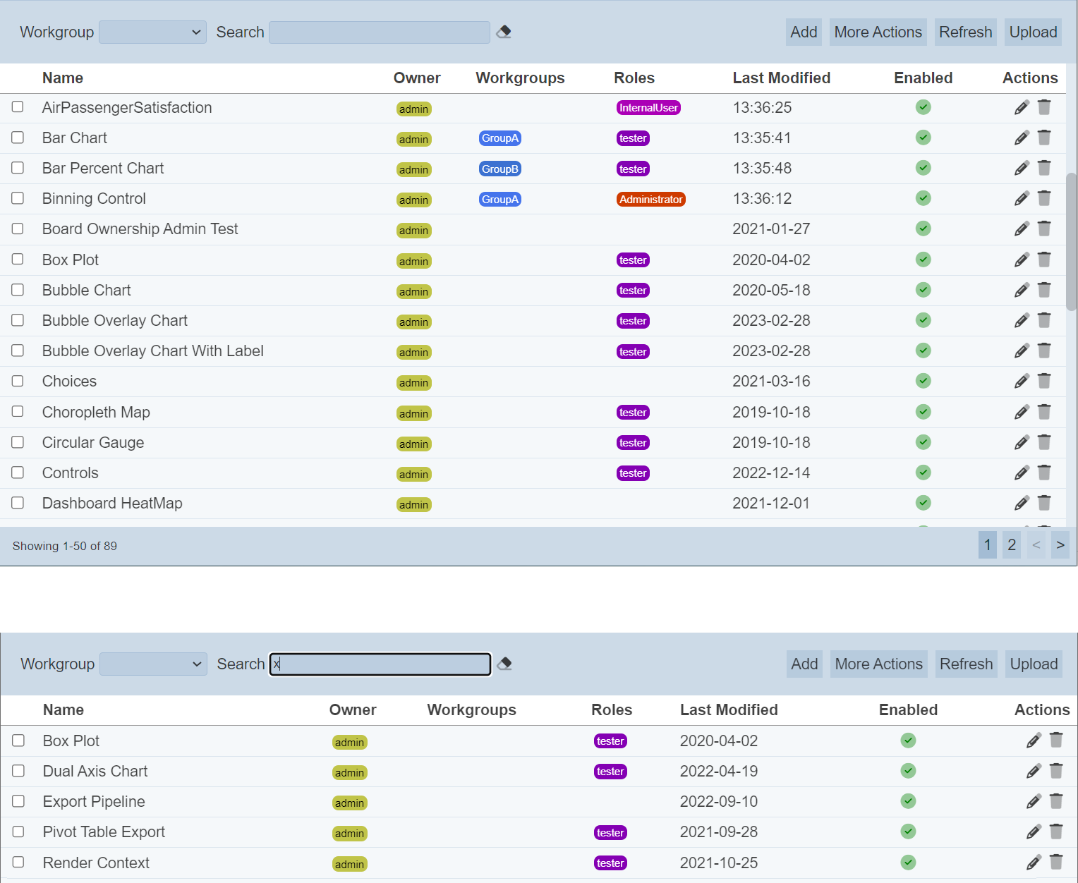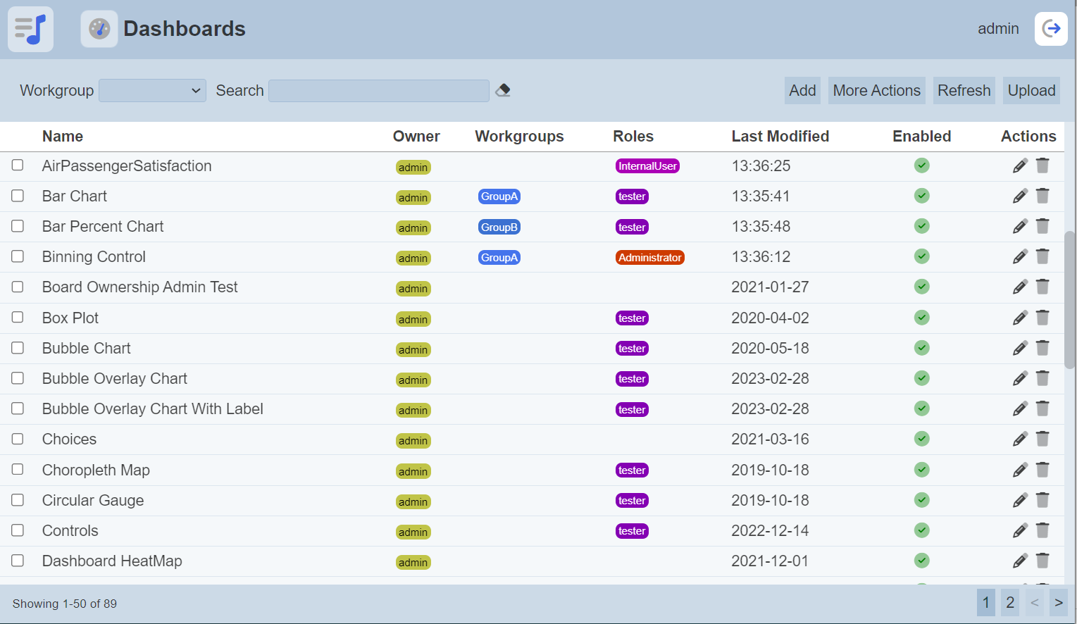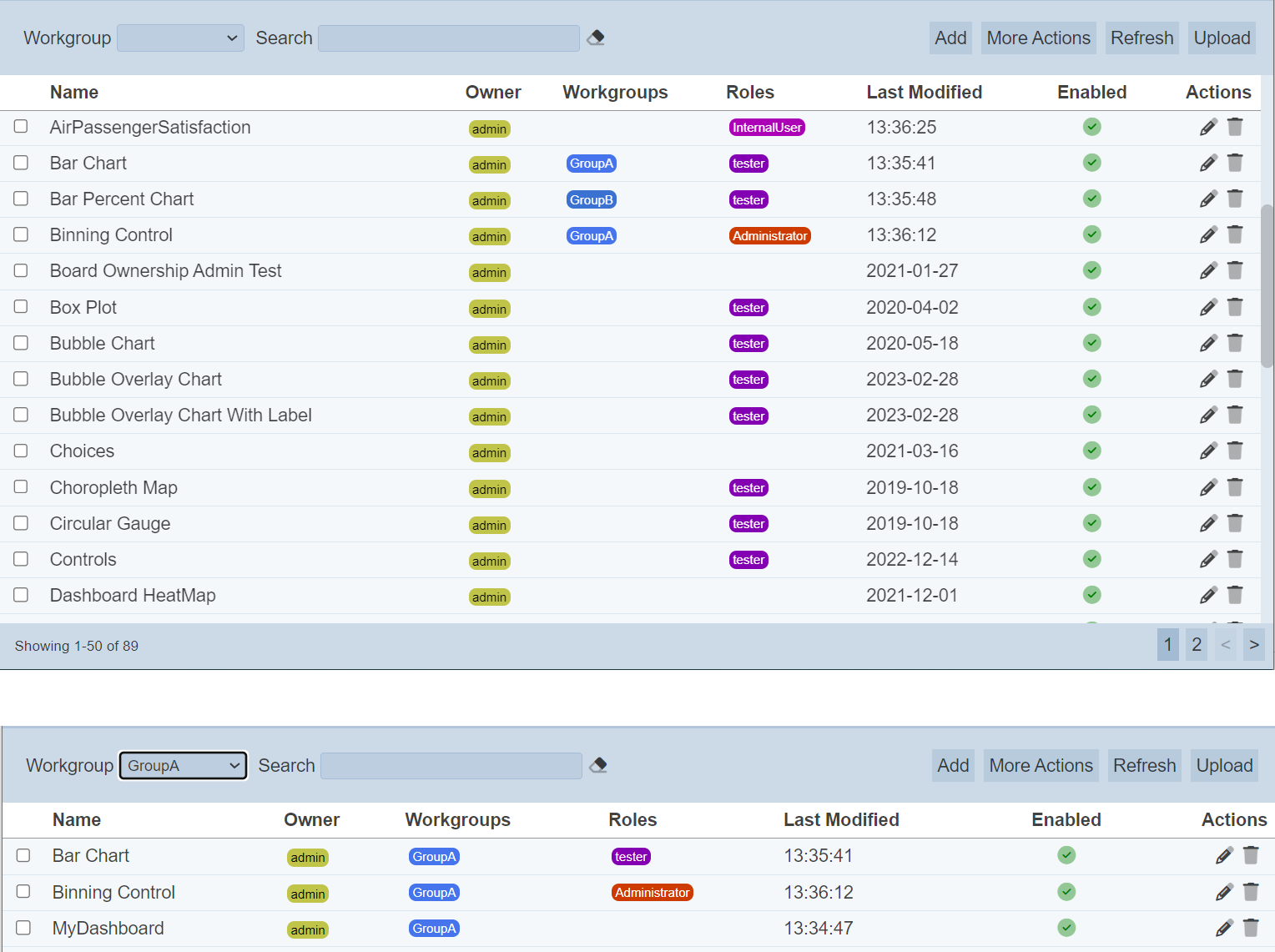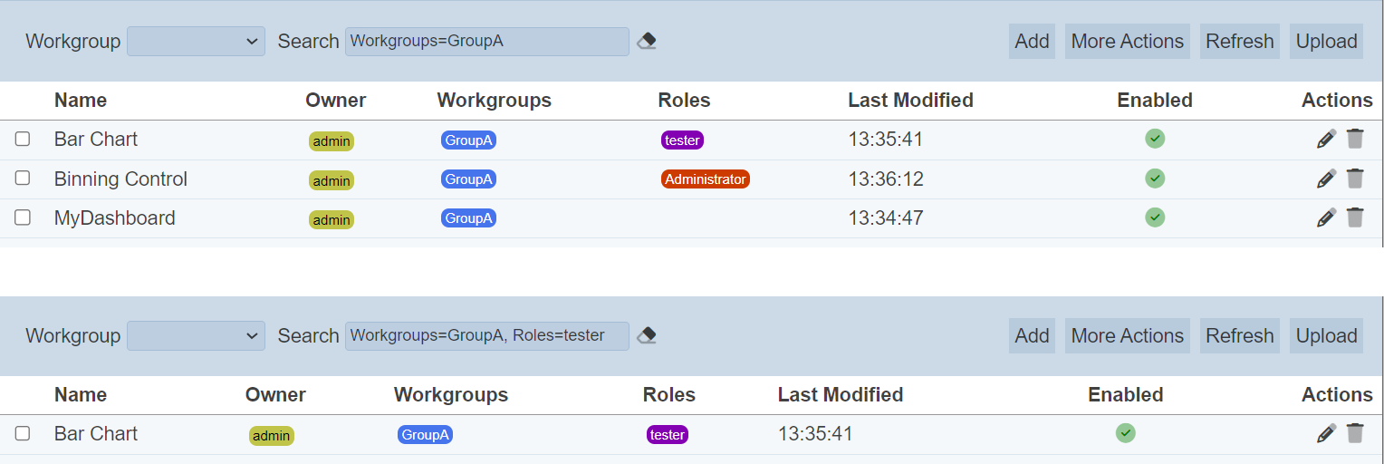 In the example above, dashboards that are assigned the workgroup “GroupA” and role “tester” are shown.