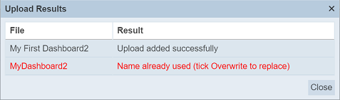 After clicking on the “OK” button on the upload dialog, a record of a new dashboard is uploaded (new name given) or an existing dashboard with the same name (existing name with “Overwrite” selected) is updated. An message will appear if the name already exist and the overwrite checkbox is not selected.
