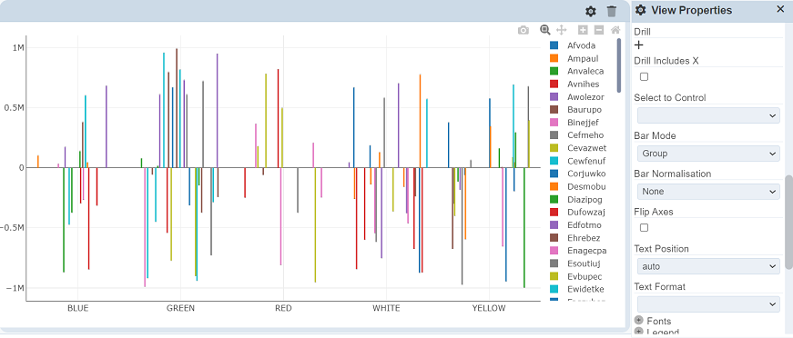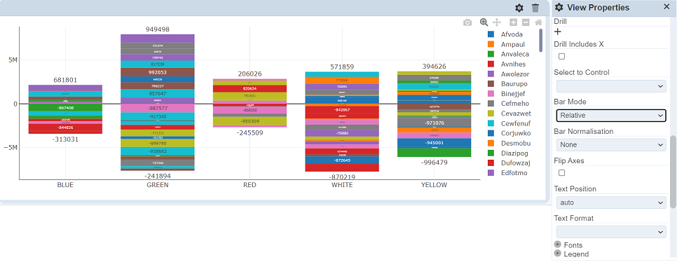 - Relative - displays each bar of an X axis on top of each other, with the largest values starting from the base of the Y axis (0). Bars with negative values are rendered separately from the positive-valued bars.
