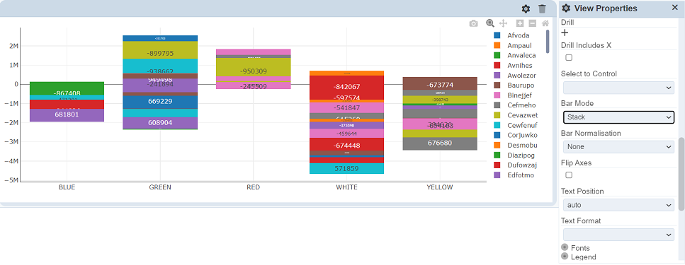 - Stack - displays each bar of an X axis on top of each other, with the largest values starting from the base of the Y axis (0). Bars with negative values overlap positive-valued bars on the positive Y axis plane.