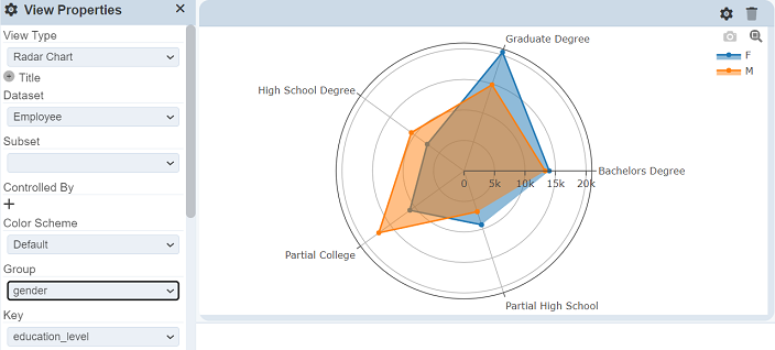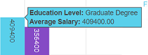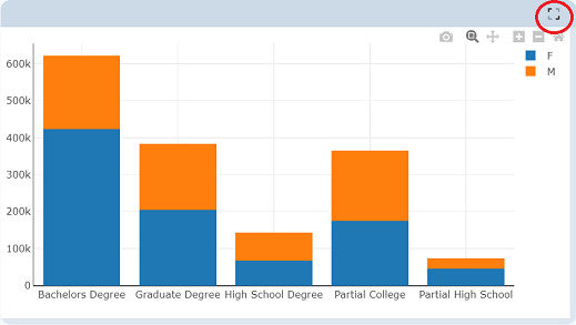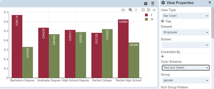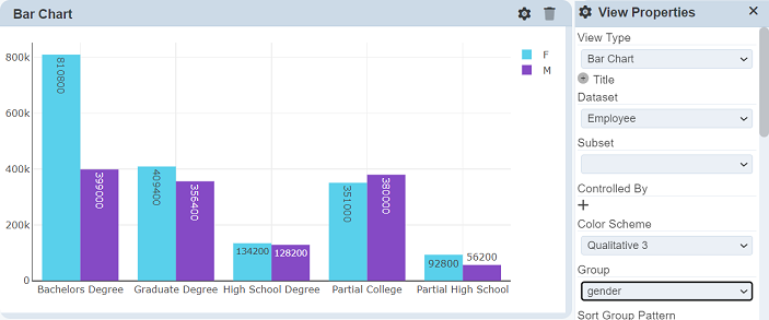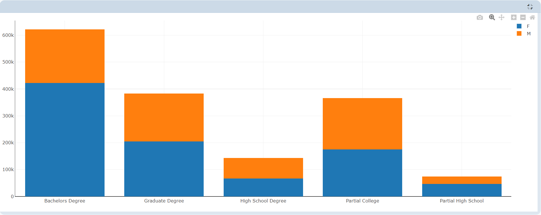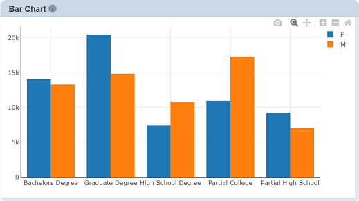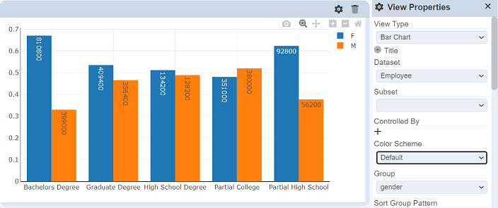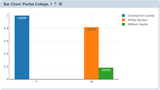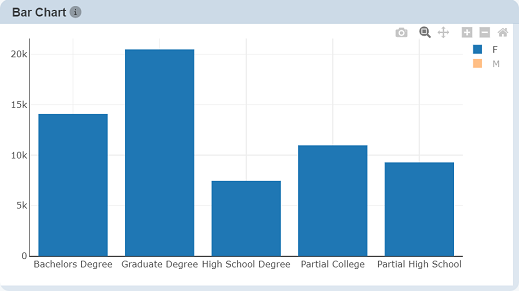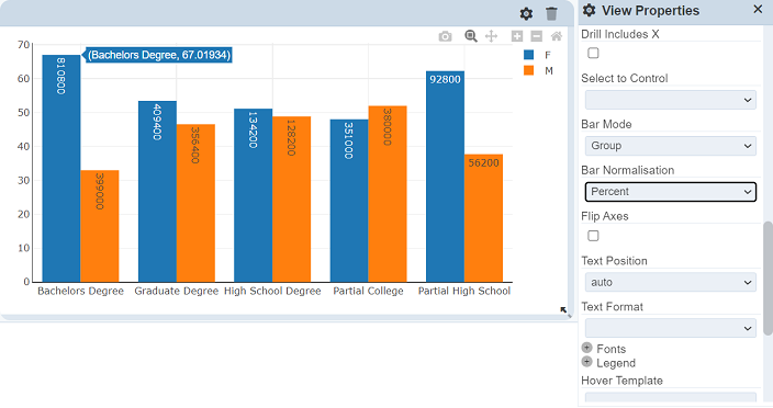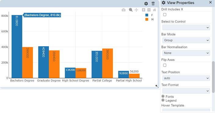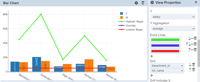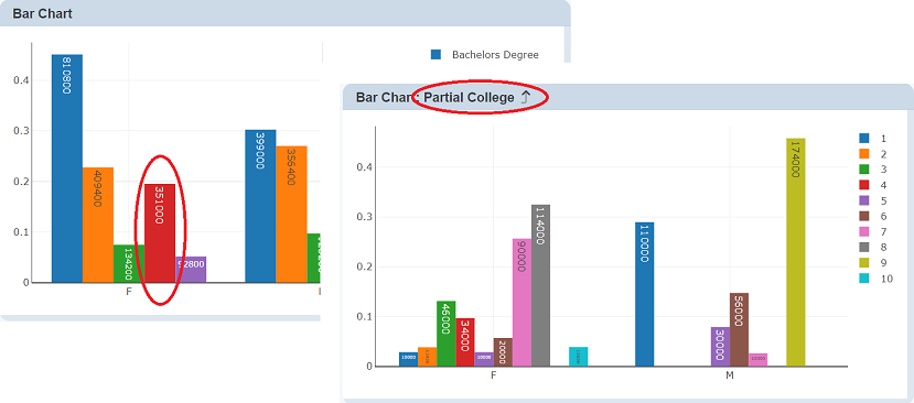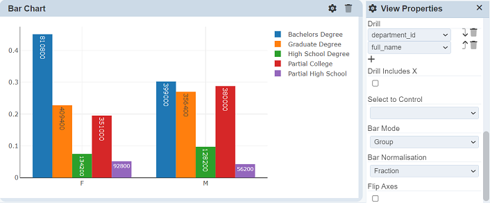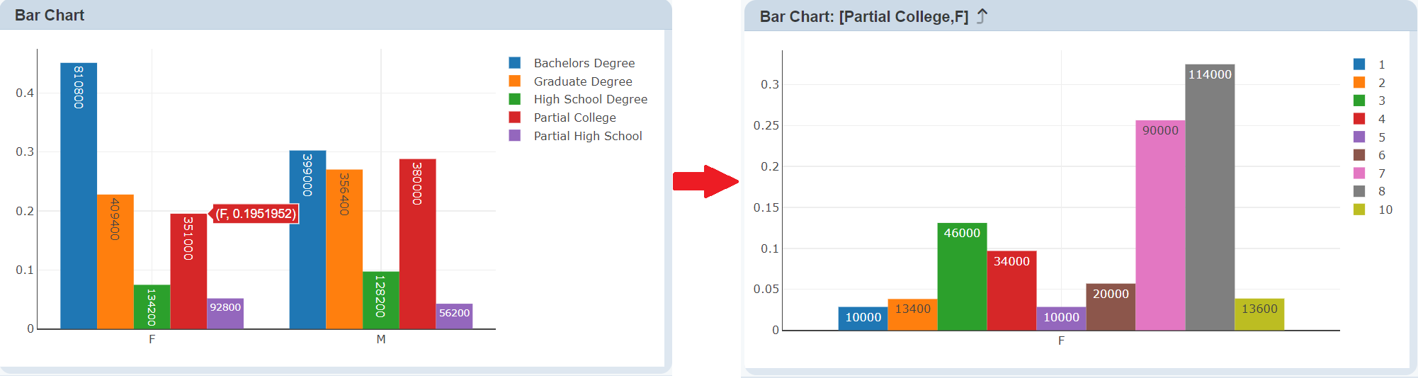 Using the same example used in the “Drill” property, with the “Drill Includes X” property enabled, the X data displayed on each drill level is limited to the X value selected on the base level. Clicking on “Partial College” data trace for for gender “F” (X value) displays all data with “Partial College” as “education_level” and “M” as “gender”.