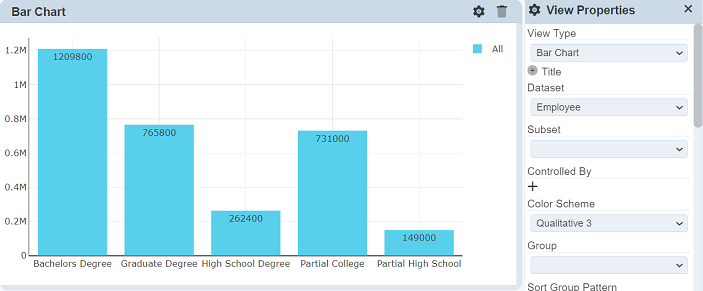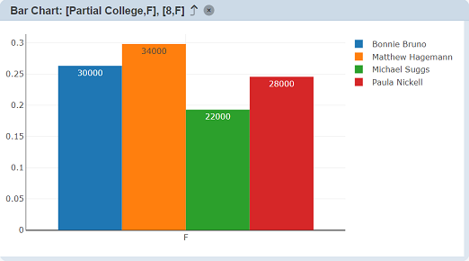 In this case, “Partial College” is selected. Only records with “education_level” of “Partial College” are rendered. The grouping is subsequently changed to the first drill down level, which is set to “department_id”. Note that the selected data group/trace is appended to the grid title.