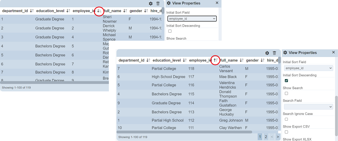 The example below illustrates the effect of using the “Initial Sort Field” and “Initial Sort Descending” properties.