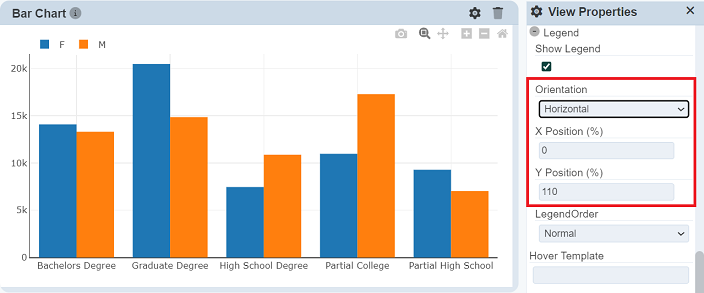 | Orientation | Determines how the legend keys would be listed. | Select | One value can be selected. Available options are: - Horizontal - displays each legend key horizontally, from left to right - Vertical - displays each key vertically, from top to bottom |