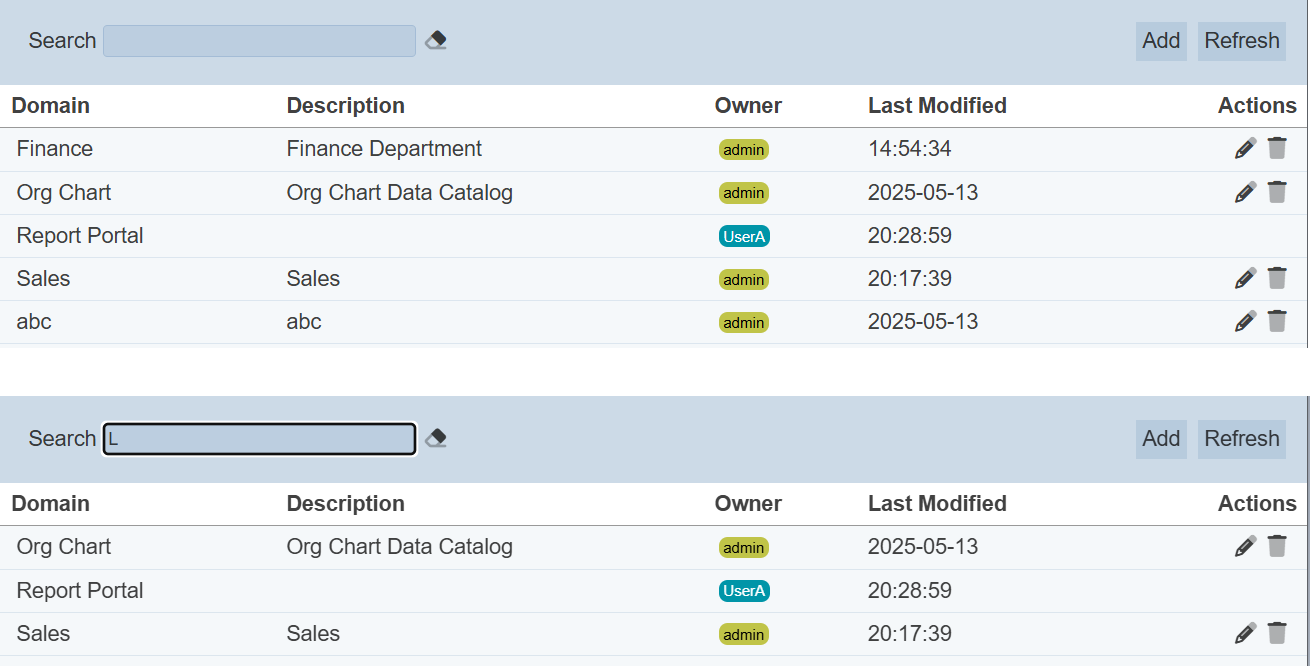 In the example above, Business Glossary that contains the letter “L” and owner “admin” are shown.