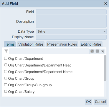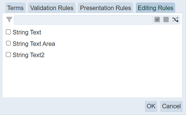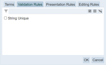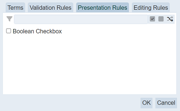 The next three tabs are the “Validation Rules”, “Presentation Rules” and “Editing Rules” tabs. These tabs allows user to setup the rules for the field. The list of rules available for selection depends on the data type of the field. An empty list may appear if no rules are created for the selected data type.