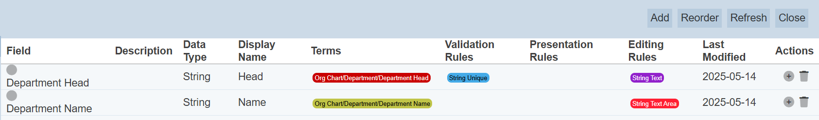 This page allows user to add, edit, delete and reorder the fields in the schema.