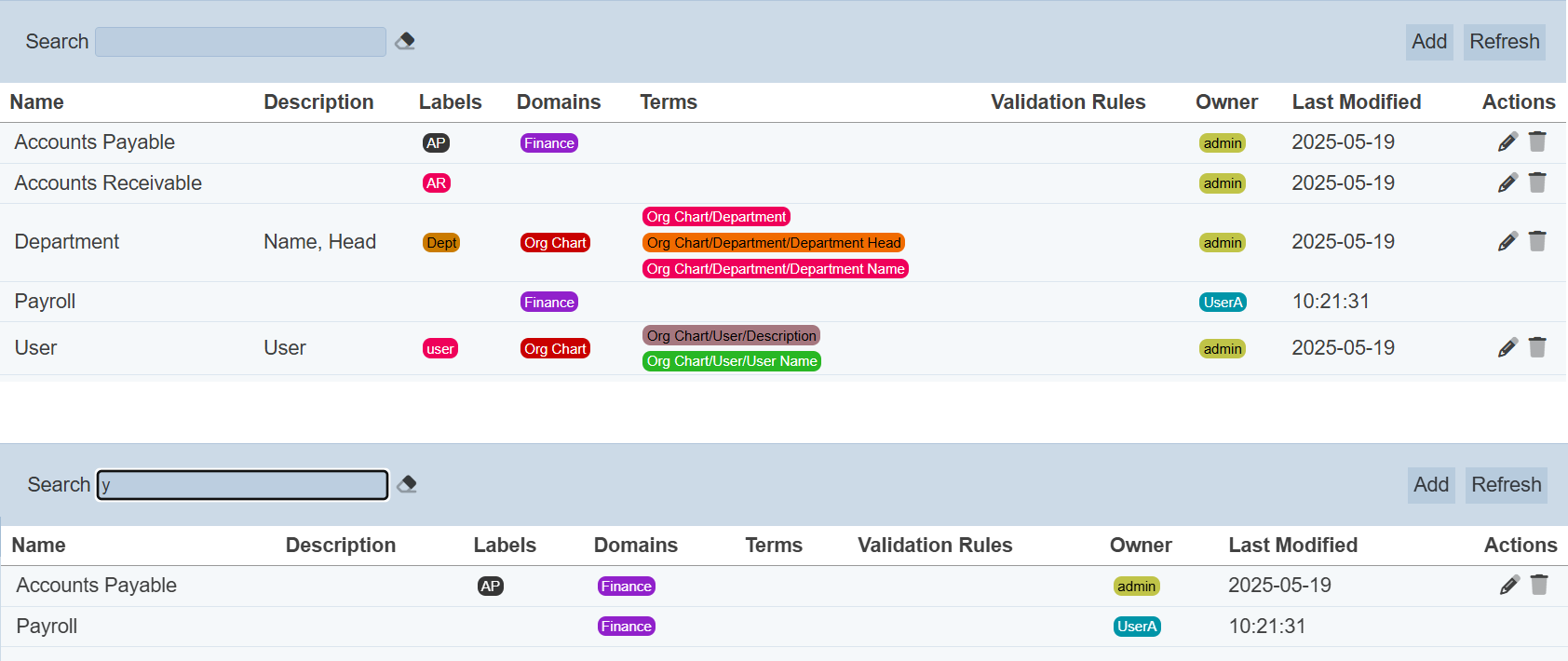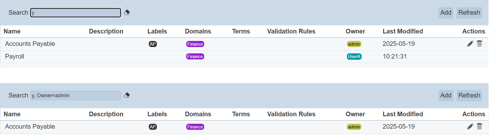 After performing actions on the browser/tab, the list is reloaded to display the Business Glossary. The manual “Refresh” button is available and is particularly useful if there are others making changes on the same page.