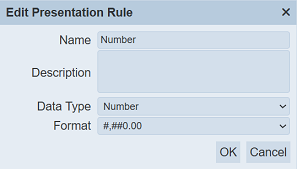 Key in a unique name for the new presentation rule in the “Name” field. Provide a brief description in the “Description” field.