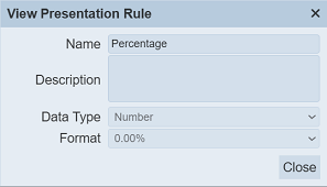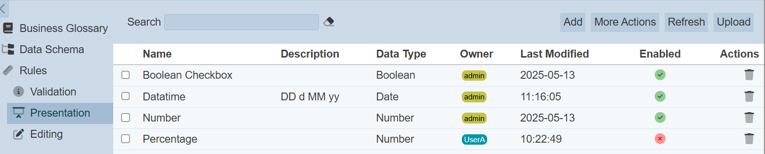 Presentation rules define the guidelines or configurations that control how data and metadata are displayed to users. These rules help to make the metadata clear, consistent, user-friendly and tailored to specific user roles or business needs.