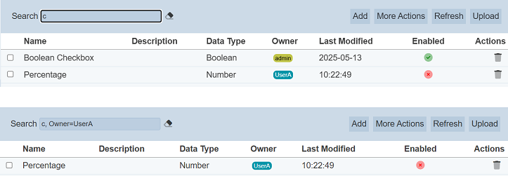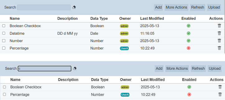 This provides an easy way to search through the list. It is case-insensitive and displays records that have the entered search value in any of the values of the fields below: