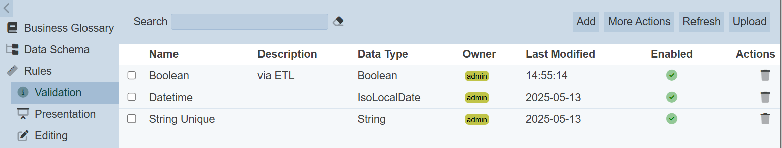 To upload one or more validation rules, click on the “Upload” button at the upper right corner of the page.