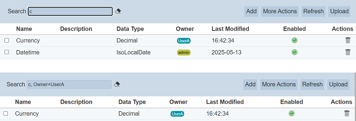 In the example above, rule that contains the letter “c” and owner “UserA” is shown.