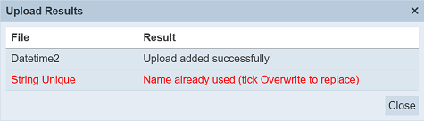 Those results in black are uploaded successfully while those in red indicates upload failures with their relevant messages. Click on the “Close” button to close the dialog box.