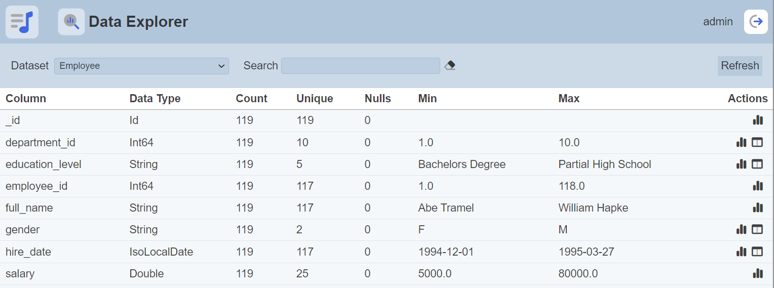 The Data Explorer module allows users to view and analyse the fields in the dataset, along with their properties.