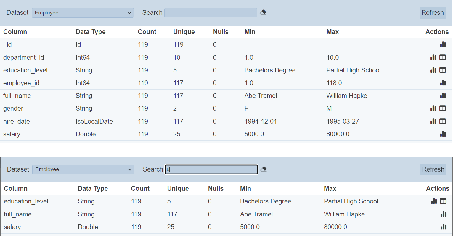 The search function at the top left of Data Explorer page, filters the data fields retaining those with matching text.