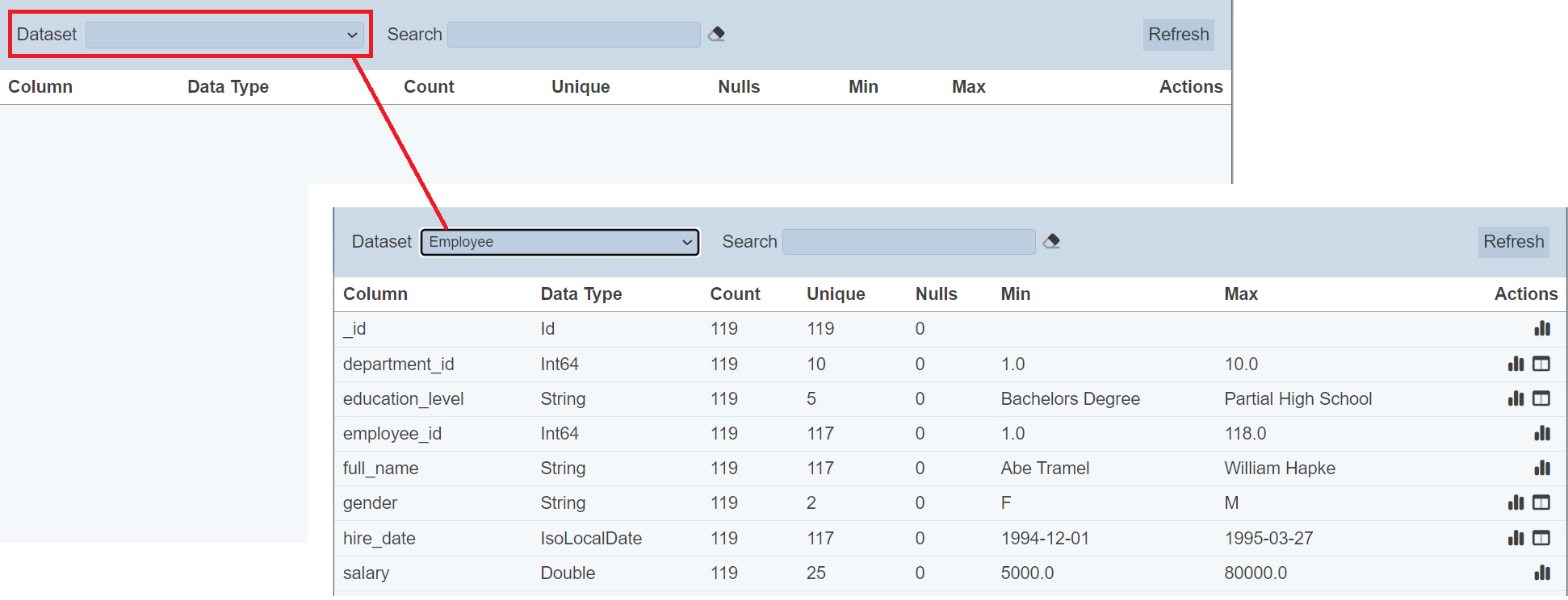 When the Data Explorer is launched, the Data Explorer page is empty, with no dataset selected. To view data, select the desired dataset from the drop-down list in the “Dataset” field at the top of the page.