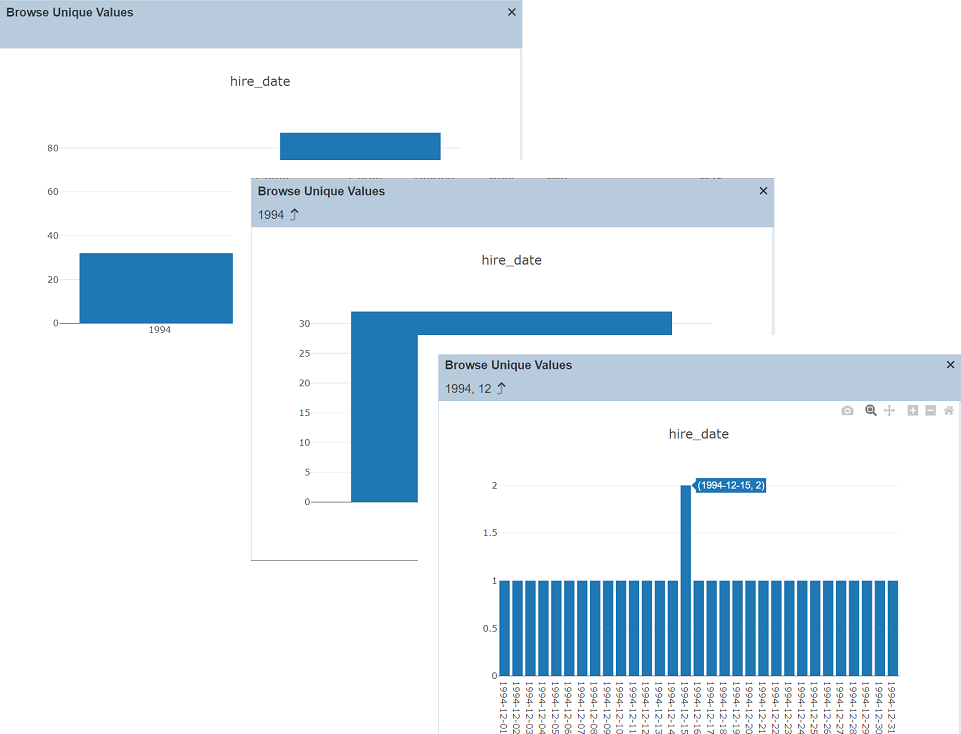 If the field’s data type is date or time, you can also drill down the chart by clicking on the column in the chart.