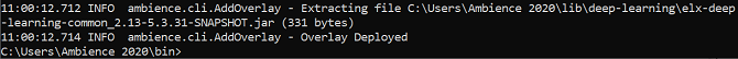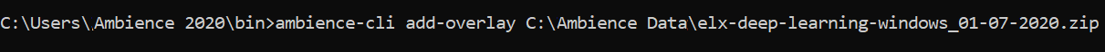 To add the Deep Learning extension library, open a Command Prompt. Navigate to the Ambience “bin” folder. Key in the command “ambience-cli add-overlay <overlay’s path>” and press the “Enter” key.