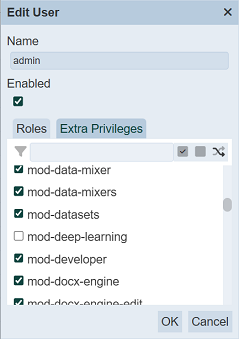 In the “Extra Privileges” panel, select the mod-deep-learning privilege to allow the selected user to access the Deep Learning module. Click on the “Save” button to save the changes. Click on the “Cancel” button to abort the action.