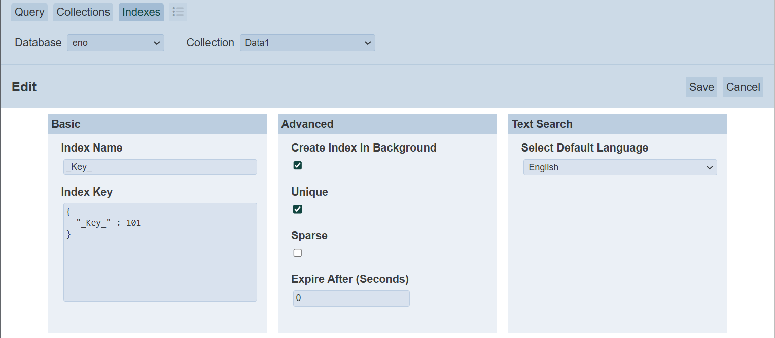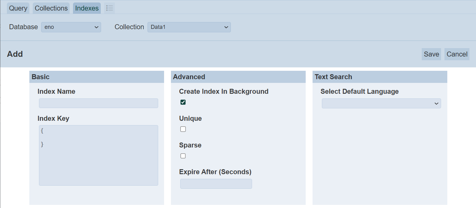 To display the indexes of a collection, select the desired database in the “Database” field and select the desired collection in the “Collection” field. The indexes of the selected collection will be displayed in the panel below.