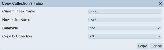 In the “New Index Name” field, the default index name is used. Change to the appropriate name if the default name is not desired. The “Database” field shows are current database of the selected index. Change to the appropriate database. In the “Copy to Collection” field, select the collect to copy the index to and click on the “Copy” button to copy the index.