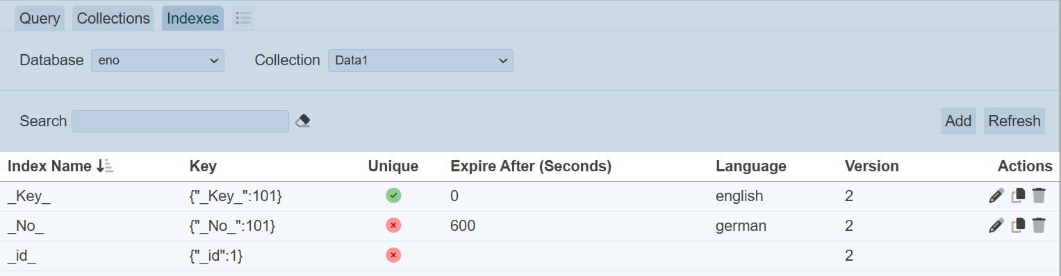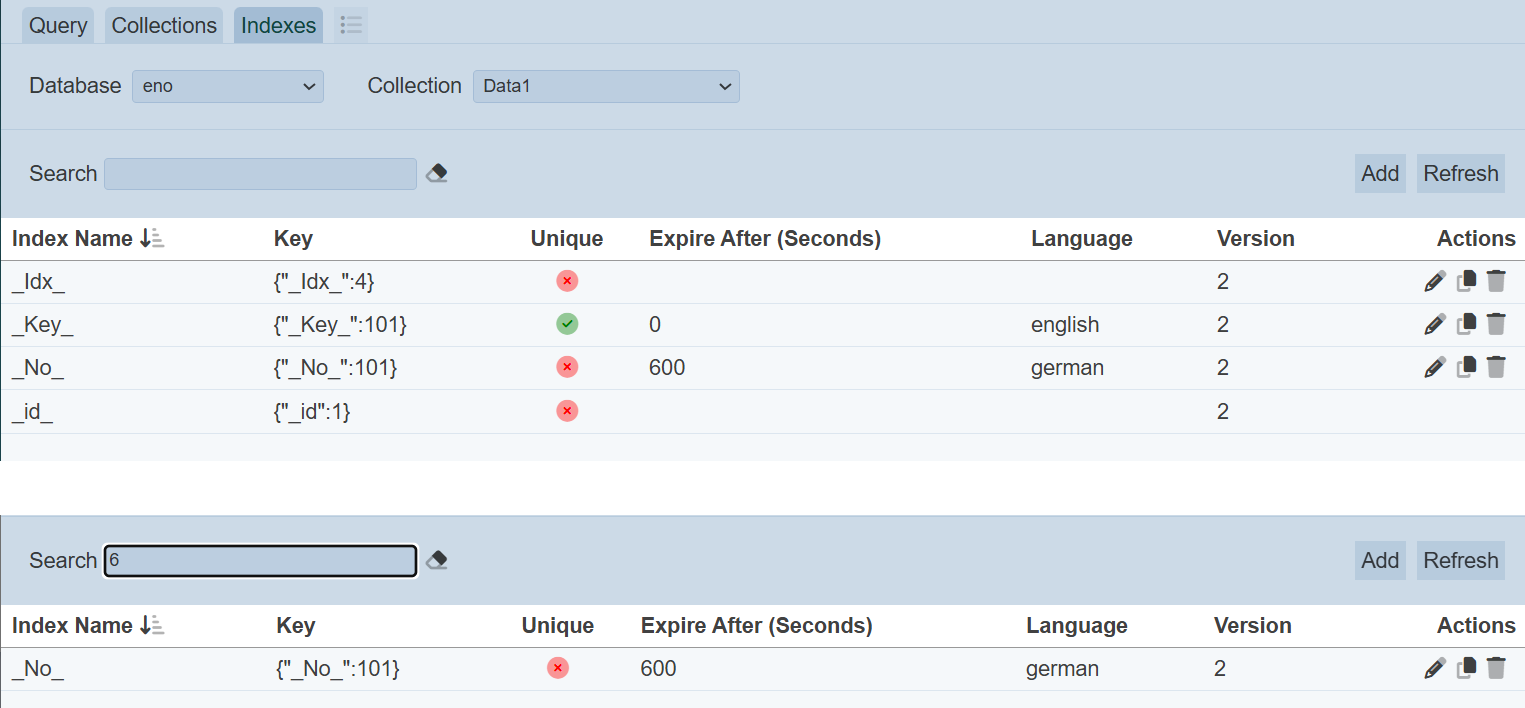 The upper part of the page allows you to select the database and collection, and search the list of indexes, as well as action buttons that you can perform on the collection. The lower part of the page displays the indexes for the selected collection and the action icons that can be performed on the indexes.