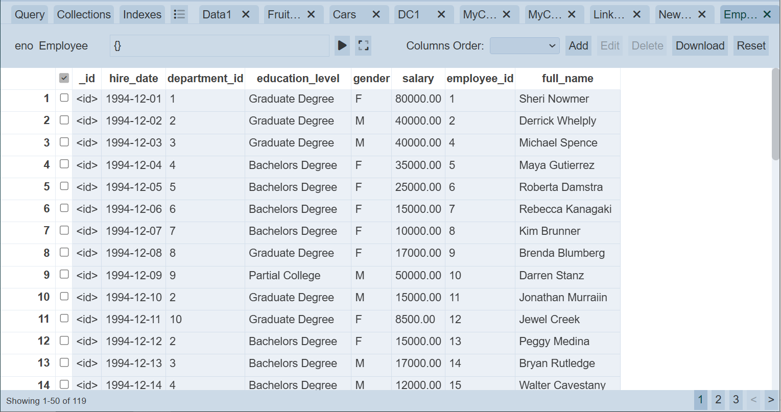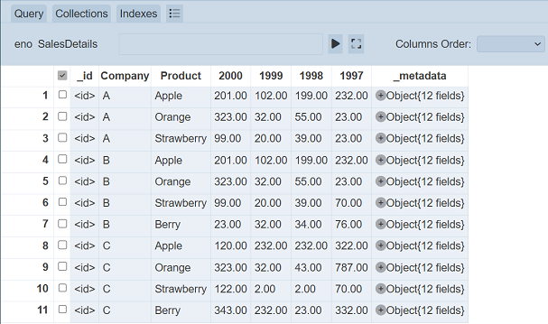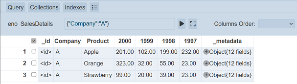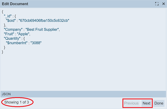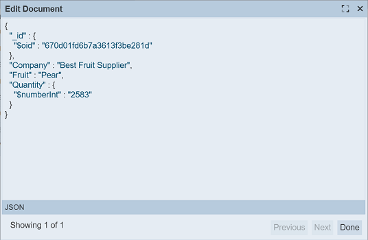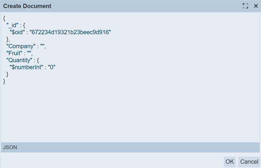 The “Create Document” dialog box will appear. The new document uses the structure of the existing records and a unique ID is randomly generated. If there are no record in the collection, an empty structure will appear.