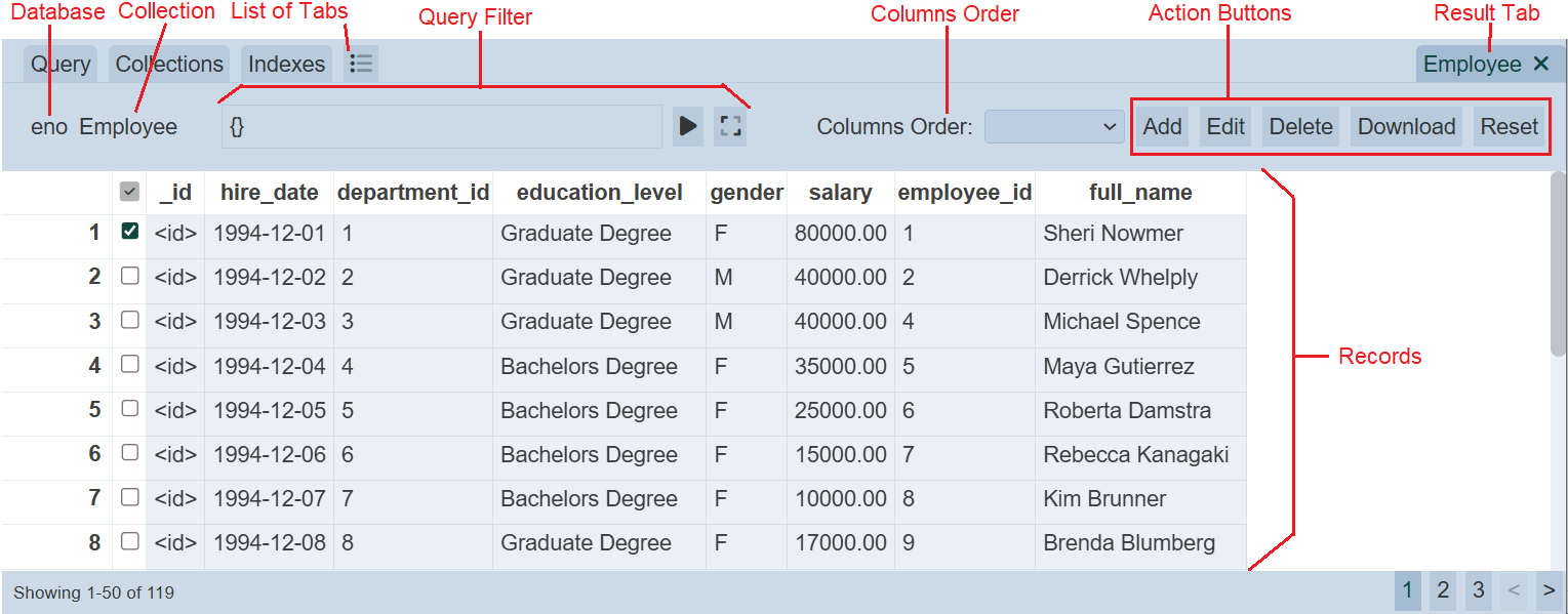 To add a new record or document into the selected collection, click on the “Add” button at the upper right corner of the page.