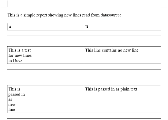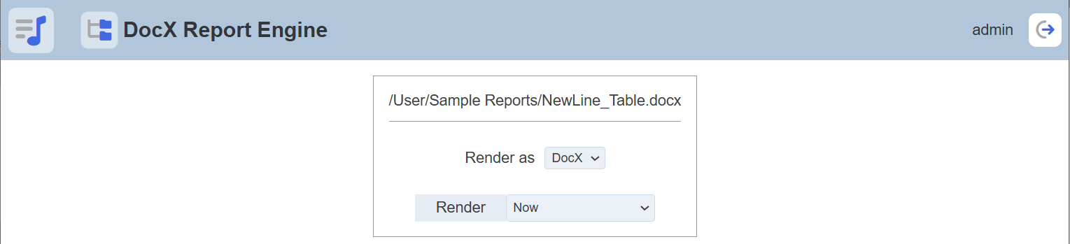 Save the DocX file (in this case, its NewLine_Table.docx) and load it into the Repository module. Ensure the DS file is in the location specified in the DocX file in the Repository module. In this example, the location is QA_Samples/DocX/datasource/NewLine.ds. In the Repository module, select the above DocX file and click on the “Render” button.
