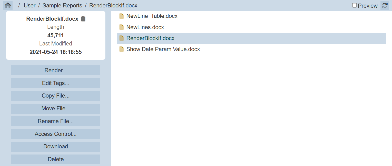 To generate the report using the user interface of the Repository module, select the DocX document and click the “Render” button.