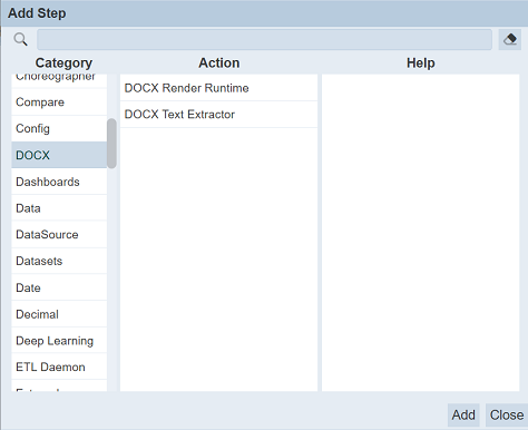 The DocX engine can be invoked using either the user interface in the Repository module or through the ETL chainset in the ETL module.