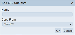 | Copy From | Indicates what template the chainset would be based on. Selecting “Blank ETL” results in using a blank canvass as a starting point while selecting an existing chainset would result in having the selected chainset as the starting template. | Y | Select | 1 value can be selected. Options are: - “Blank ETL” - names of all enabled chainsets the user currently has read access to |