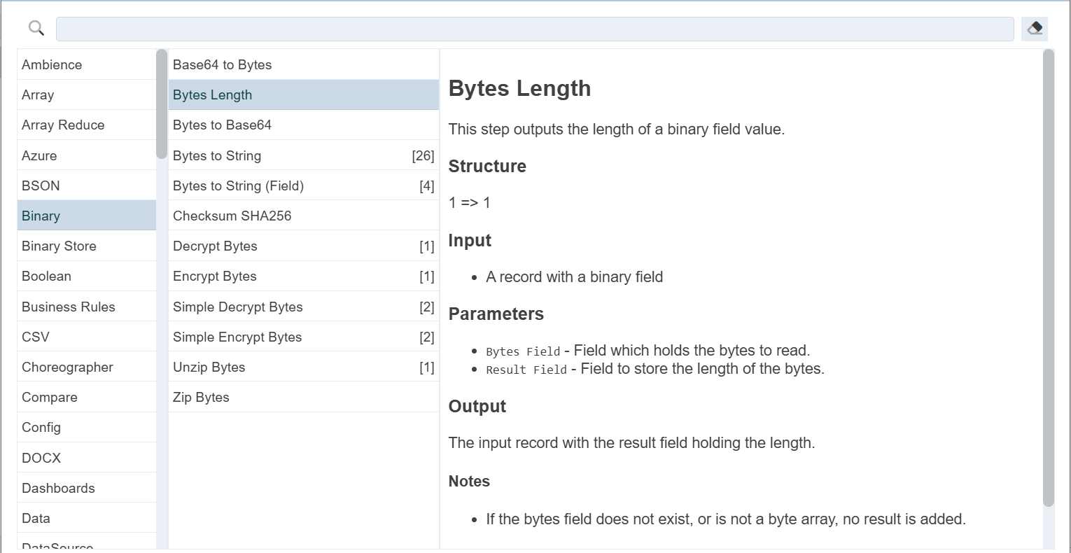 To search using category, scroll and select the desired categroy from the list of categories in the left panel. The list of ETL steps for that category will appear in the centre panel. Scroll and select the desired ETL step. The description for the selected ETL step will appear in the right panel.