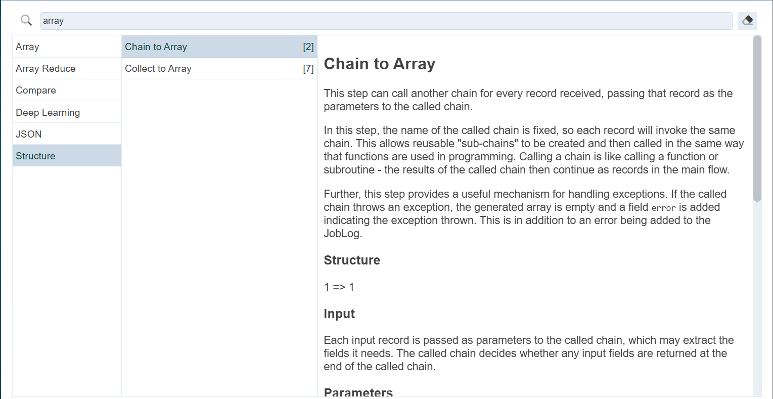 To use the search function to search for a ETL step, key in a keyword, e.g. “array”. The left panel will display the categories that have ETL step(s) containing the keyword “array”. Select the desired category and the centre panel will display the list of ETL steps containing the keyword “array”. Select the desired ETL step in the centre panel. Some ETL steps may have a number in square brackets on its right. This number indicates the number of usage of the ETL step. The description for the ETL step will appear in the right panel.