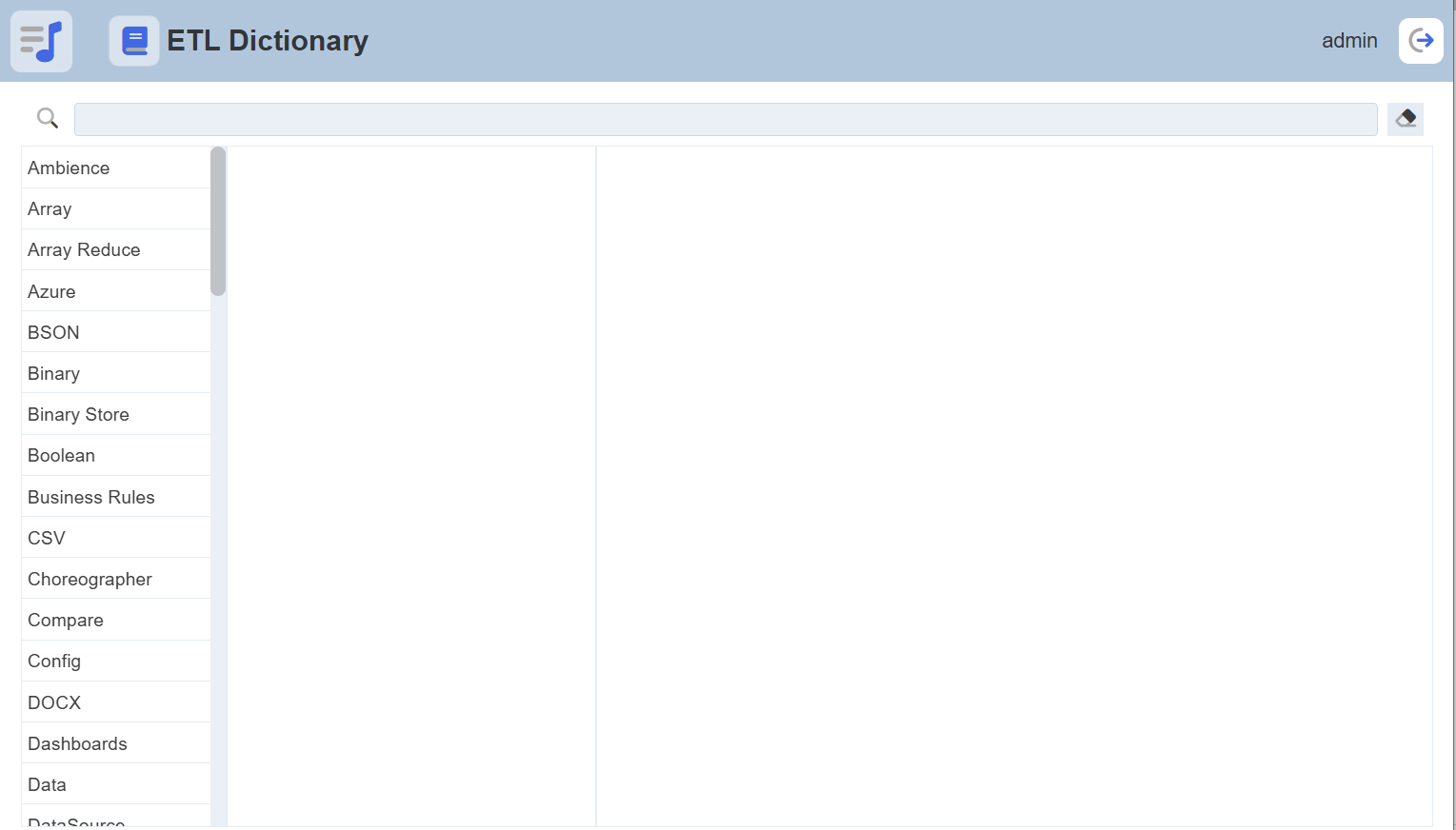 The page can be divided into several parts: The search function at the top of the page allows user to key in keyword to search for the ETL step. The left panel displays the categories of ETL. The centre panel displays the ETL steps of the category selected. The right panel displays the description of the ETL selected.