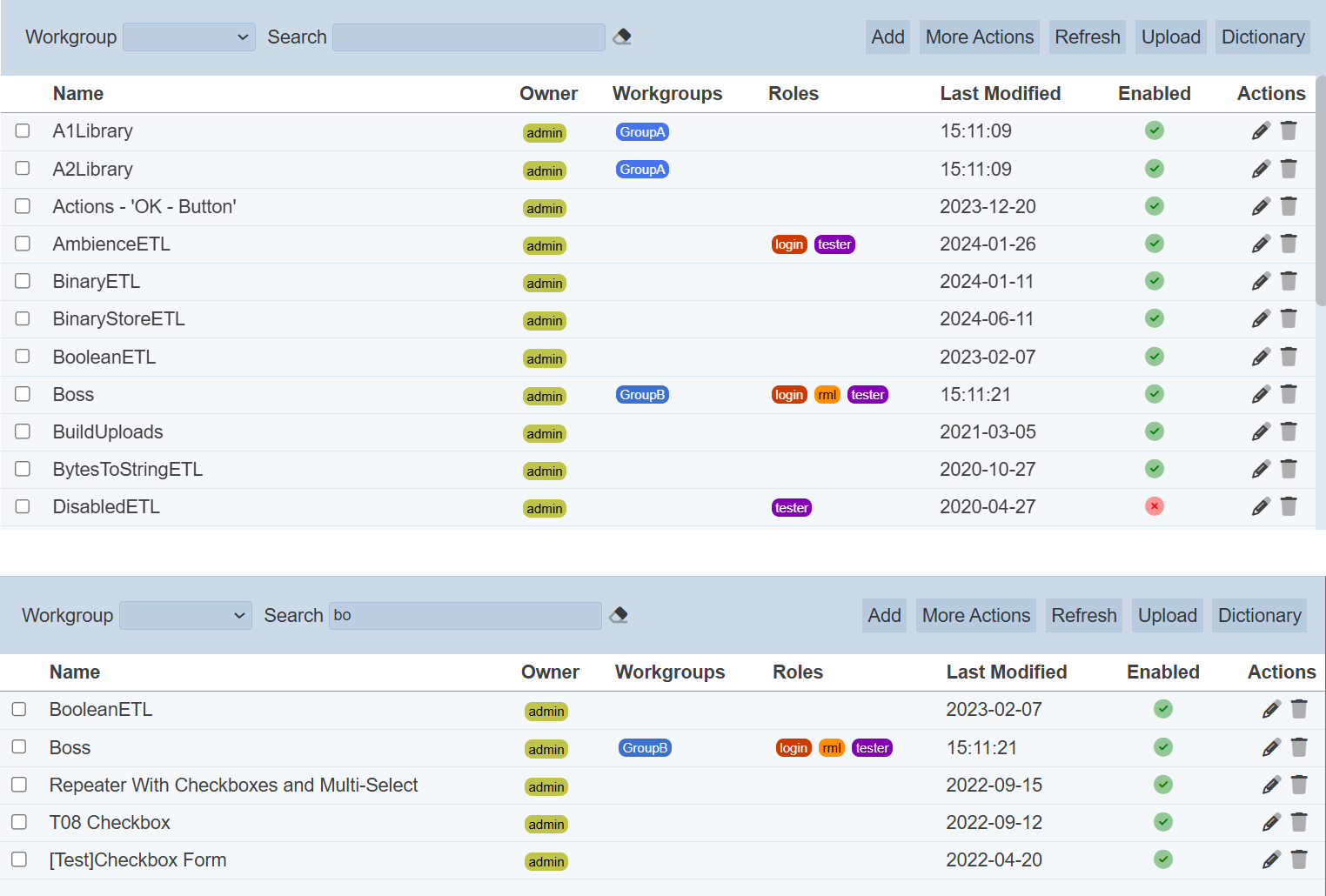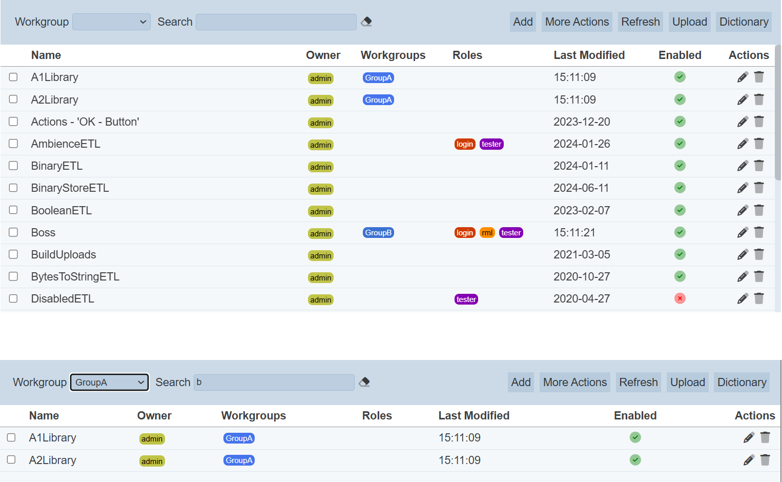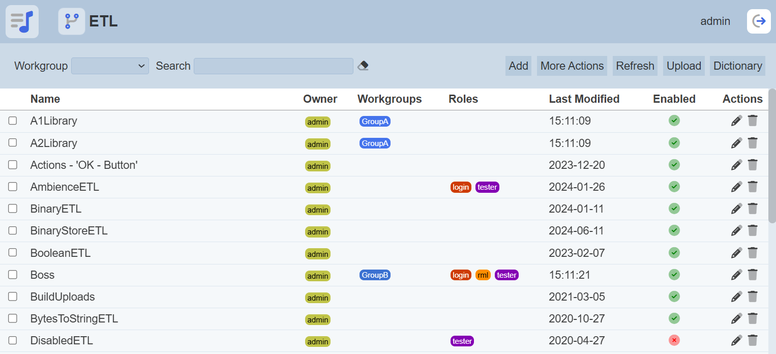 The “Workgroup” field at the top left corner of the page allows you to filter the ETLs associated with the selected workgroup.
